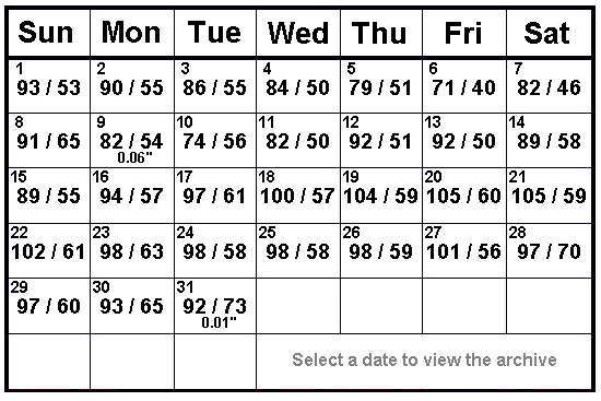 Records for this site go back to 1988. March 2026 was the warmest March of all 38 years. The average high was 92° breaking the old record of 87° in 1997. The average low was 57° breaking the old record of 54° in 2004. There were 15 daily highs that were tied or broken and we set a new record for the warmest March day. Before this year, the record warmest March day was 102° on March 26, 1988 and March 16, 2007. 104° on March 19 set a new record which was immediately broken on March 20 and tied on the 21st. The high both days was 105°. March 1, 2026 93° set a new record high temperature. The old record was 88° in 2009. March 2, 2026 90° tied the record high temperature also recorded in 2009. March 12, 2026 92° tied the record high temperature also recorded in 1989. March 13, 2026 92° tied the record high temperature also recorded in 2017. March 18, 2026 100° set a new record high temperature. The old record was 95° in 2017. March 19, 2026 104° set a new record high temperature. The old record was 95° in 2017,1997. We also briefly set a new record for the warmest day in March, a record which lasted almost 24 hours. The warmest March day was 102° on March 26, 1988 and March 16, 2007. March 20, 2026 105° set a new record high temperature. The old record was 99° in 1997. We also set a new record for the warmest day in March. The warmest March day was 104° yesterday. March 21, 2026 105° set a new record high temperature. The old record was 97° in 2004. We also tied the record, set yesterday, for the warmest day in March. March 22, 2026 102° set a new record high temperature. The old record was 94° in 1997. March 23, 2026 98° set a new record high temperature. The old record was 93° in 1990. March 24, 2026 98° tied the record high temperature also recorded in 2025. March 25, 2026 98° set a new record high temperature. The old record was 95° in 2022. This was the 8th consecutive day of record high temperatures. March 27, 2026 101° set a new record high temperature. The old record was 98° in 1988. March 28, 2026 97° set a new record high temperature. The old record was 91° in 2004. March 29, 2026 97° set a new record high temperature. The old record was 96° in 2004. This was the 15th day this month the record high temperature was tied or broken.